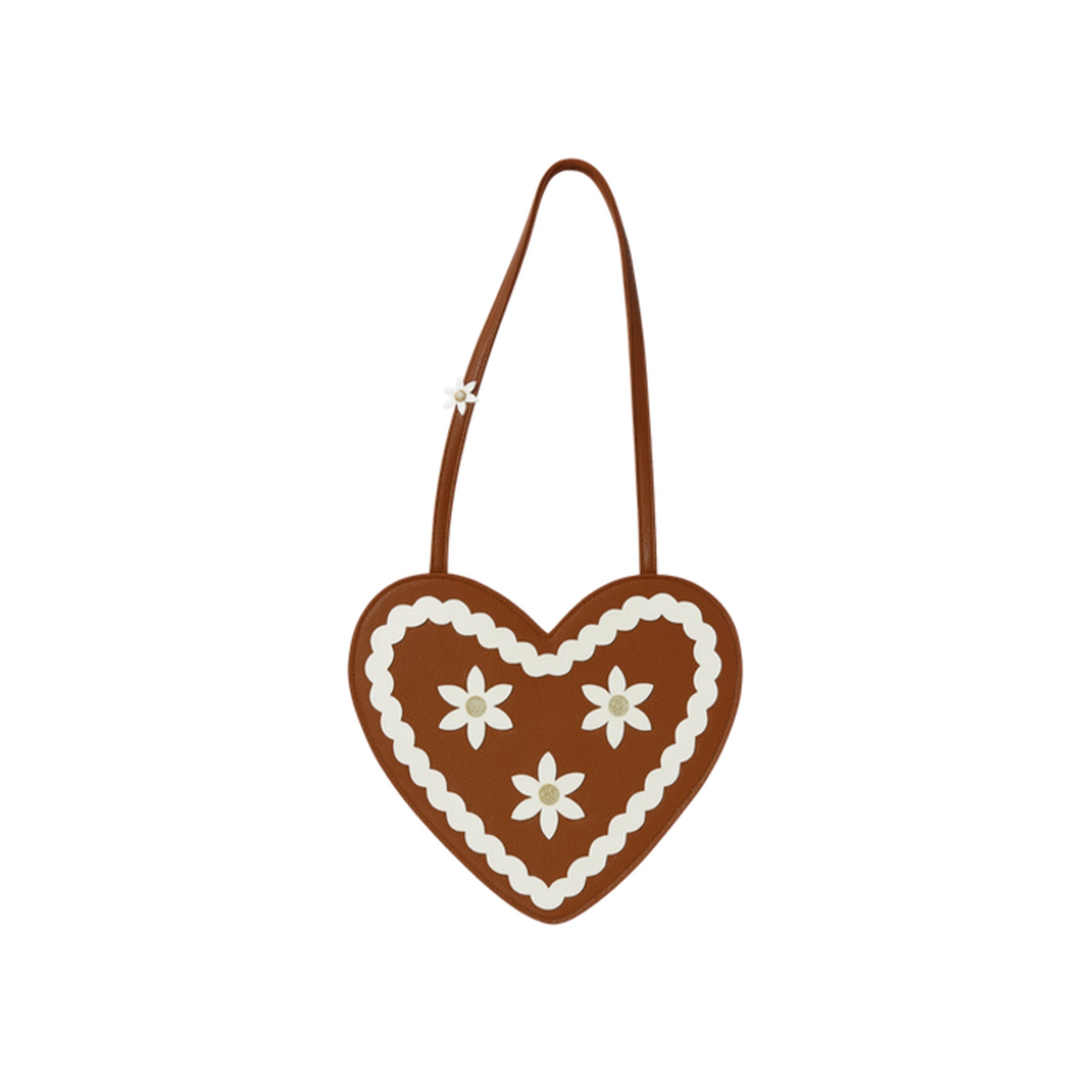 Inspired by the classic Oktoberfest gingerbread heart, this heart-shaped bag is made from soft, vegan leather and decorated with glittering edelweiss details and a wavy icing rim. A delicate flower on the shoulder strap adds the perfect alpine charm. Whether at the folk festival, the festival or the playground - this bag is made for dancing, giving as a gift and collecting sweet memories.